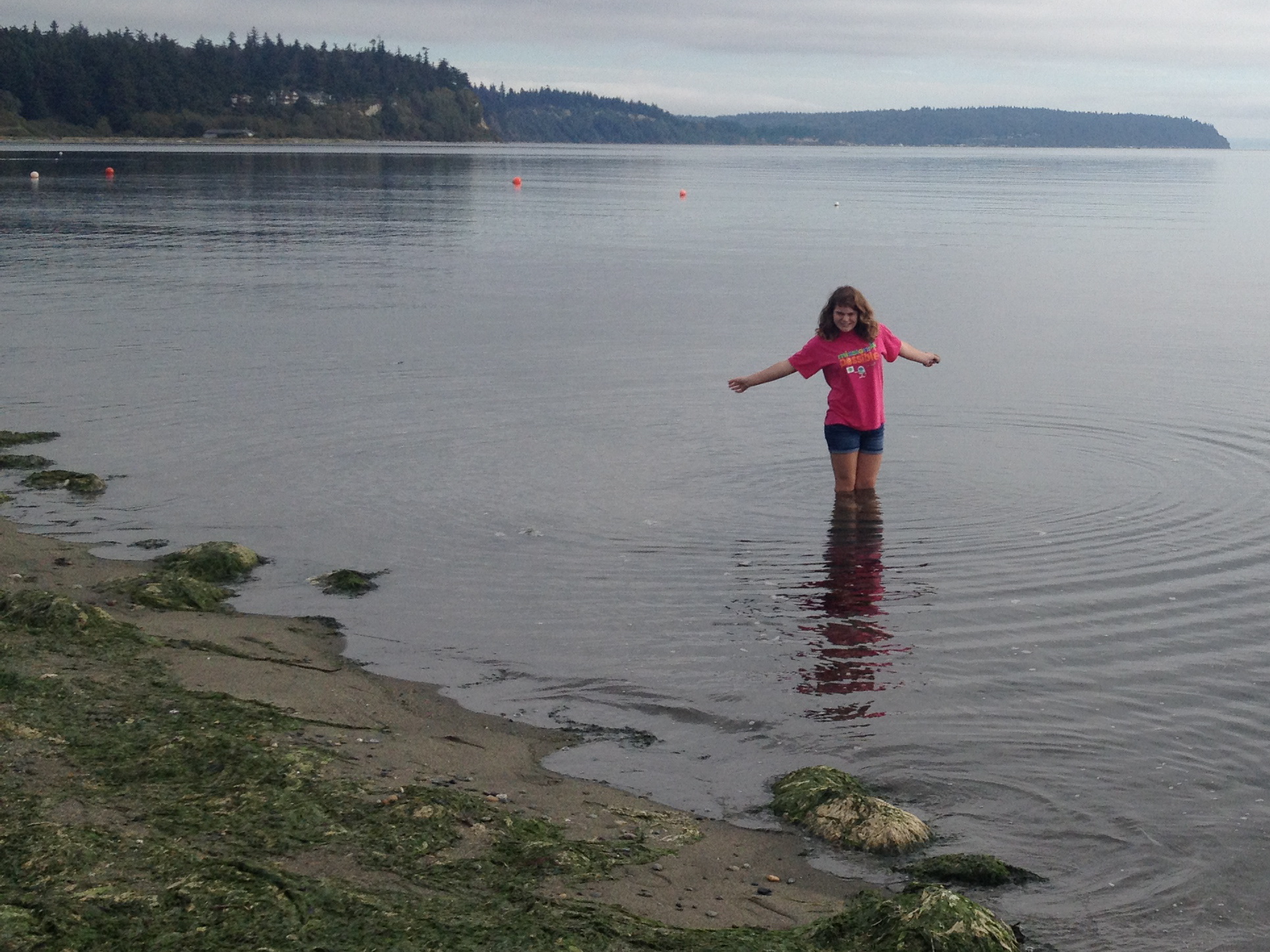 After lunch we headed over to Sunlight Beach, where Robin’s grandparents’ house is. The girls and Teddy enjoyed cavorting on the beach, and Sophia went wading, even though the water was pretty cold. The tide was in, so we couldn’t walk out on the tide flats, which are quite extensive. Sunlight Beach is on Useless Bay, so called because it’s so shallow that it’s useless for ships. When the tide is out, you can walk out a mile or more on the sand. You just have to remember to head back before the tide comes in.