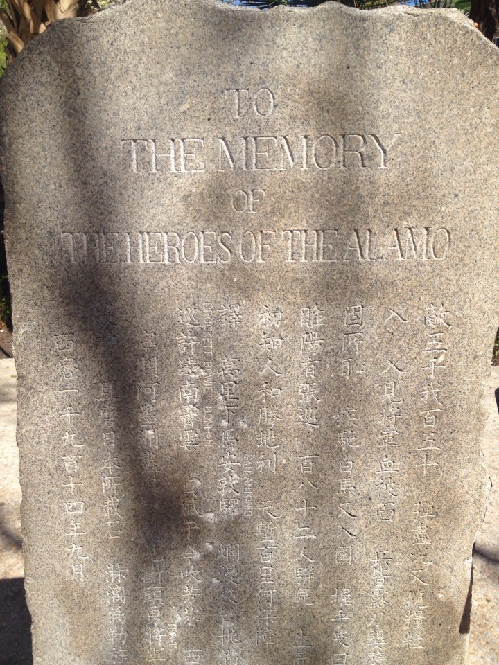 Why would there be a monument in Chinese or Japanese? It turns out that it was donated to the Alamo in 1914 by a Japanese geography professor. The writing, which is in Classical Chinese, is a poem that the professor wrote comparing the Alamo to the Siege of Nagashino Castle, in 1575.