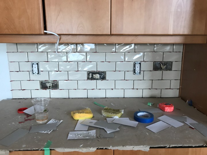 Kitchen backsplash. The animal accent tiles are by a local tile maker.