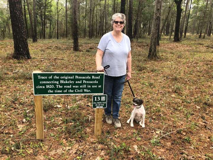 Robin and Teddy with a historical marker along the old road between Blakeley and Pensacola, Fla.