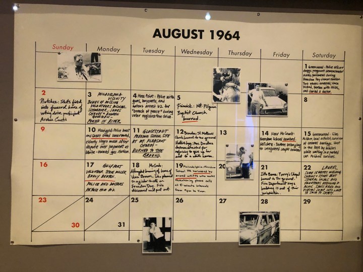 I can’t possibly describe all the exhibits, so I will concentrate on one I thought was among the most interesting, having to do with the Mississippi Summer Project of 1964, a voter-registration effort that became known as Freedom Summer. The reason I liked the exhibit is that it had lots of documents and artifacts, including an organization chart of the Council of Federated Organizations, the group that spearheaded the effort; a calendar; a typewritten “Security Handbook” for dealing with the often-violent racist response; and, most telling, an FBI missing-persons notice for Andrew Goodman, James Chaney, and Michael Schwerner, the three civil-rights workers who were murdered.