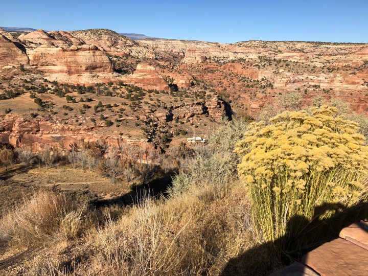 A Joshua tree flower, with our camper in the background